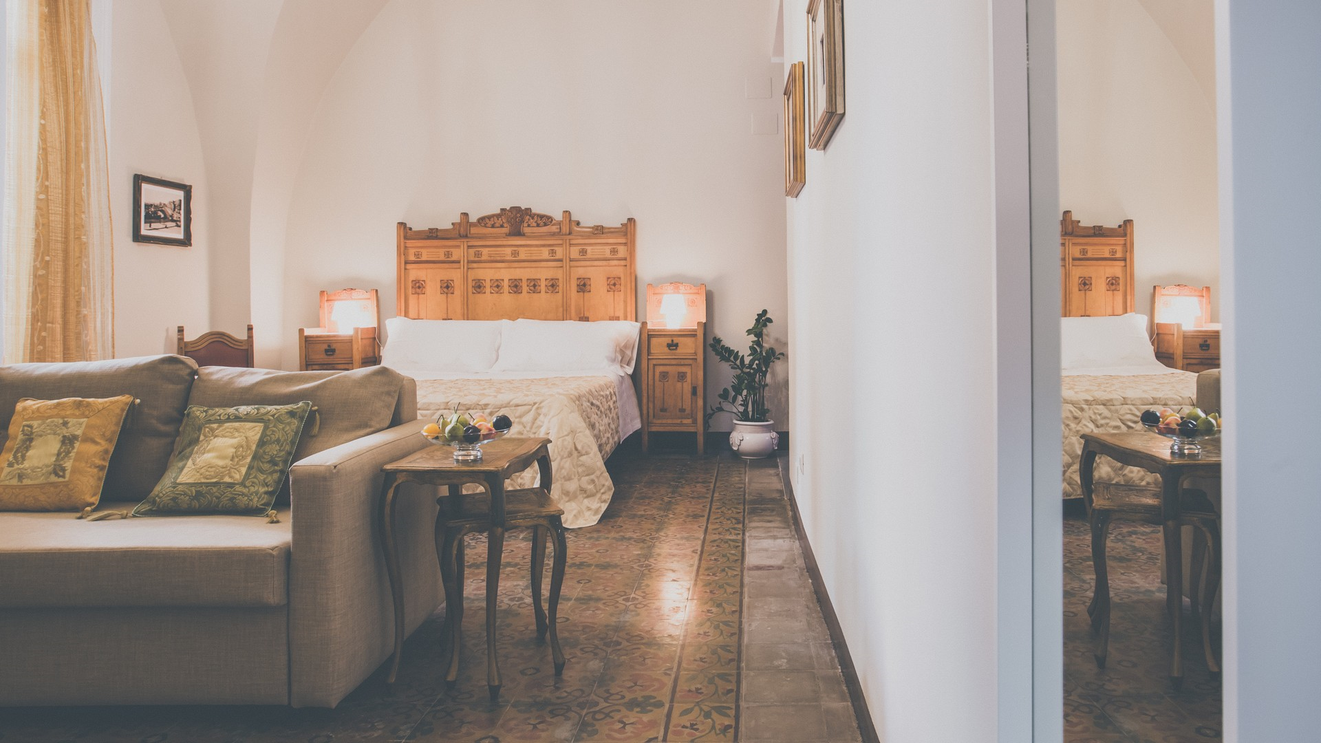 The elegant and spacious 35 sqm suite, lit by a large window overlooking the internal courtyard of the building, it is perfect for those traveling with family or friends. The original floor, made up of classic cement tiles, features floral themes. Floral motifs also adorn the precious Art Nouveau bed in solid walnut wood and the pink marble bedside tables. The suite Il Barone is also equipped with a living area with sofa beds that allow you to transform the room, if necessary, into a triple or quadruple. The equipment is completed by: table with chairs, Wi-Fi, 42-inch LCD TV, wardrobe, desk , air conditioning and independent heating, private bathroom with shower, hairdryer, linen and toiletries. Children 0-2 years (camping cot available upon request): free Children up to 10 years in bed with parents: free Pets not accepted Corporate agreements on request Tourist City tax € 1.50 per day per person, not included and to be paid in cash upon arrival. PLEASE NOTE. The rates indicated may be subject to variations (eg. particular promotions or special offers). It is advisable to consult the booking section.