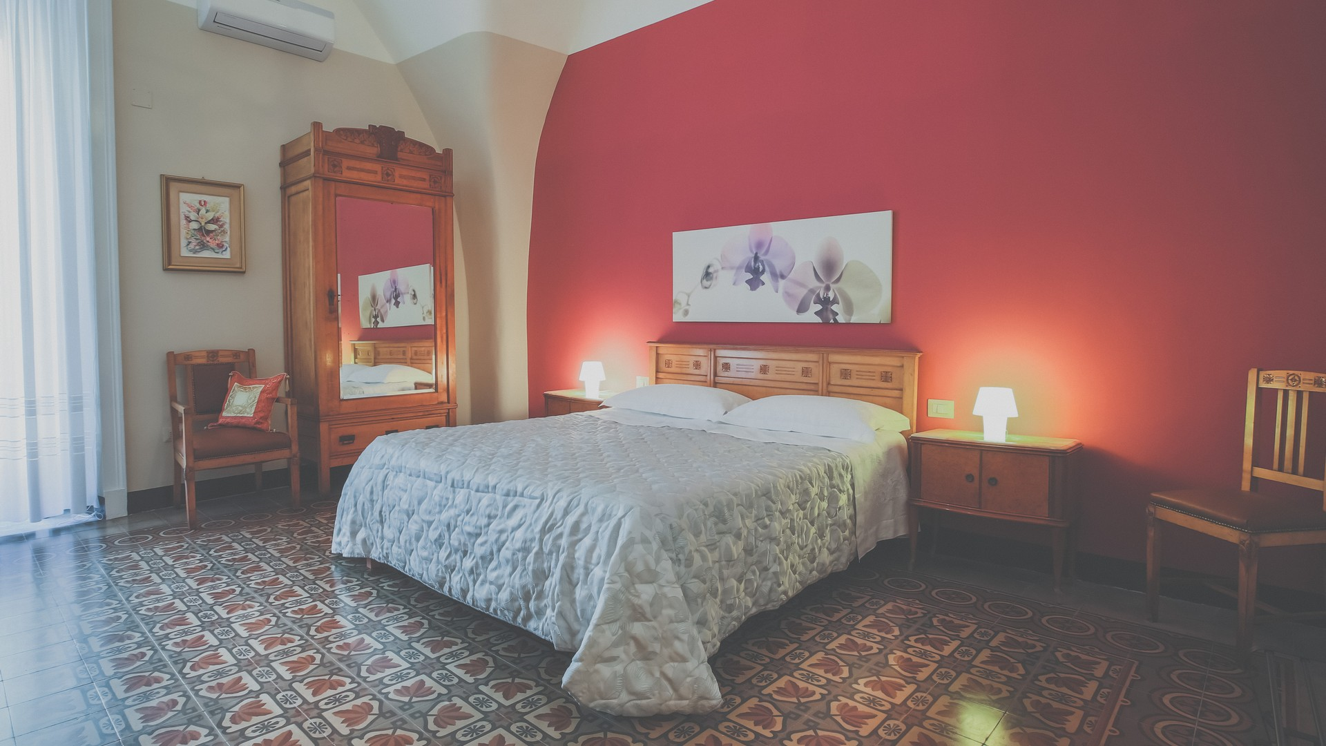 Elegant, bright, equipped with every comfort but, above all, the most romantic room of the B&B; this is the perfect description of La Baronessa, a room embellished by the pavilion vaulted roof, the cementine flooring with hints of amaranth and authentic Art Nouveau furniture. This room, which has a large independent balcony, is ideal for those who want to relive the charm of forgotten atmospheres and enjoy a sweet dreamy stay. The room offers an independent balcony, bed, wardrobe and vintage desk, Wi-Fi, 39-inch LCD Smart TV, air conditioning and heating, private bathroom with shower, hairdryer, linen and toiletries . Children 0-2 years (camping cot available upon request): free Children up to 10 years in bed with parents: free Pets not accepted Corporate agreements on request Tourist City tax € 1.50 per day per person, not included and to be paid in cash upon arrival. PLEASE NOTE. The rates indicated may be subject to variations (eg. particular promotions or special offers). It is advisable to consult the booking section.
